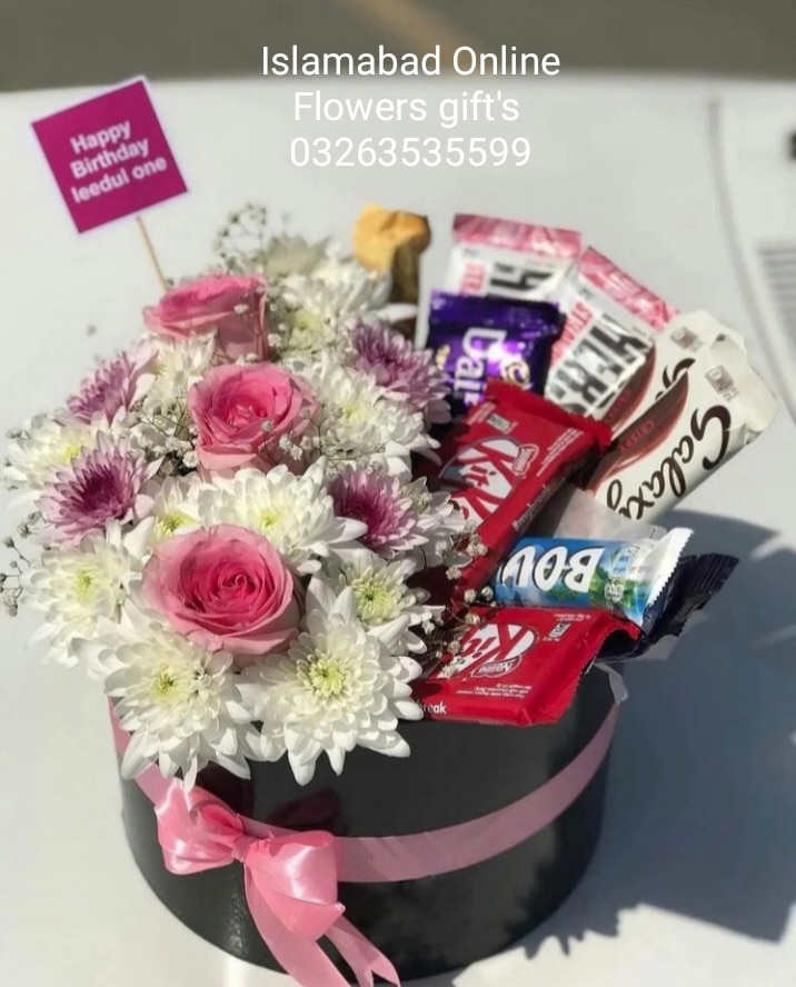 Flower chocolate box Flower chocolate box -August 23, 2022 Flower chocolate box . Red Roses , White baby breath , White gladiolus , Chocolates ,Red Ribbon , Box .